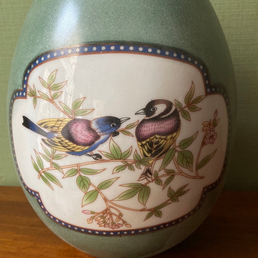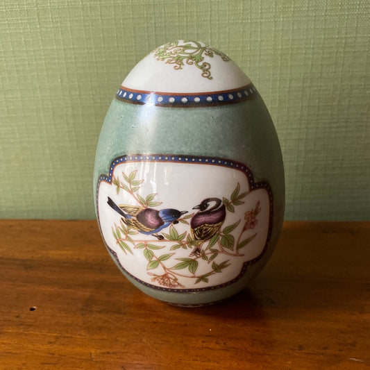 Uovo aperto decoro azzurro con base in bronzo e uccellino