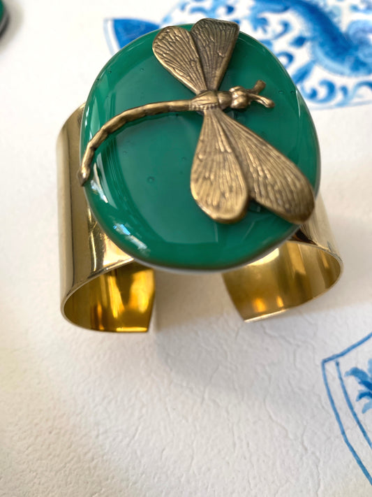 Bracciale ottone con placca ovale e libellula light jade Vetrofuso