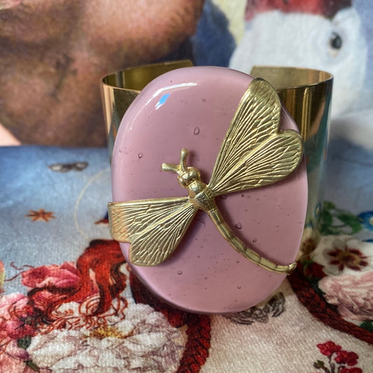 Bracciale in ottone con placca ovale in vetro fuso di Murano dusty pink con libellula Vetrofuso