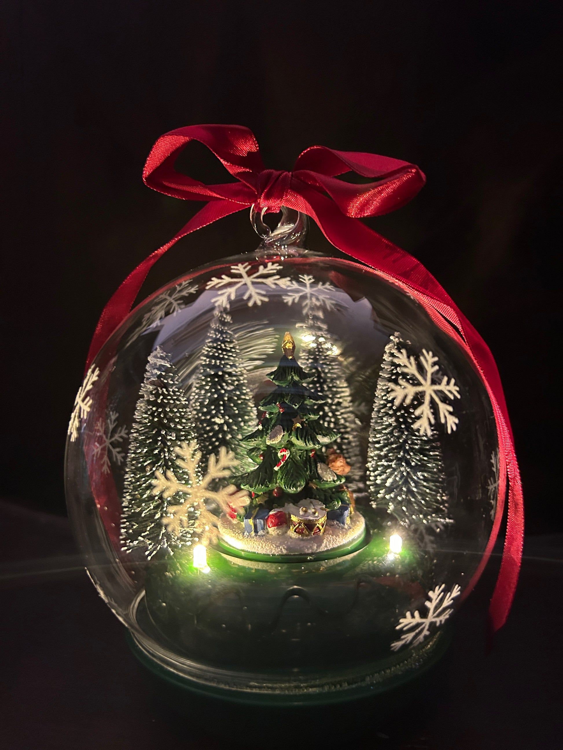 Sfera trasparente da appendere con luce movimento e musica abete verde centrale