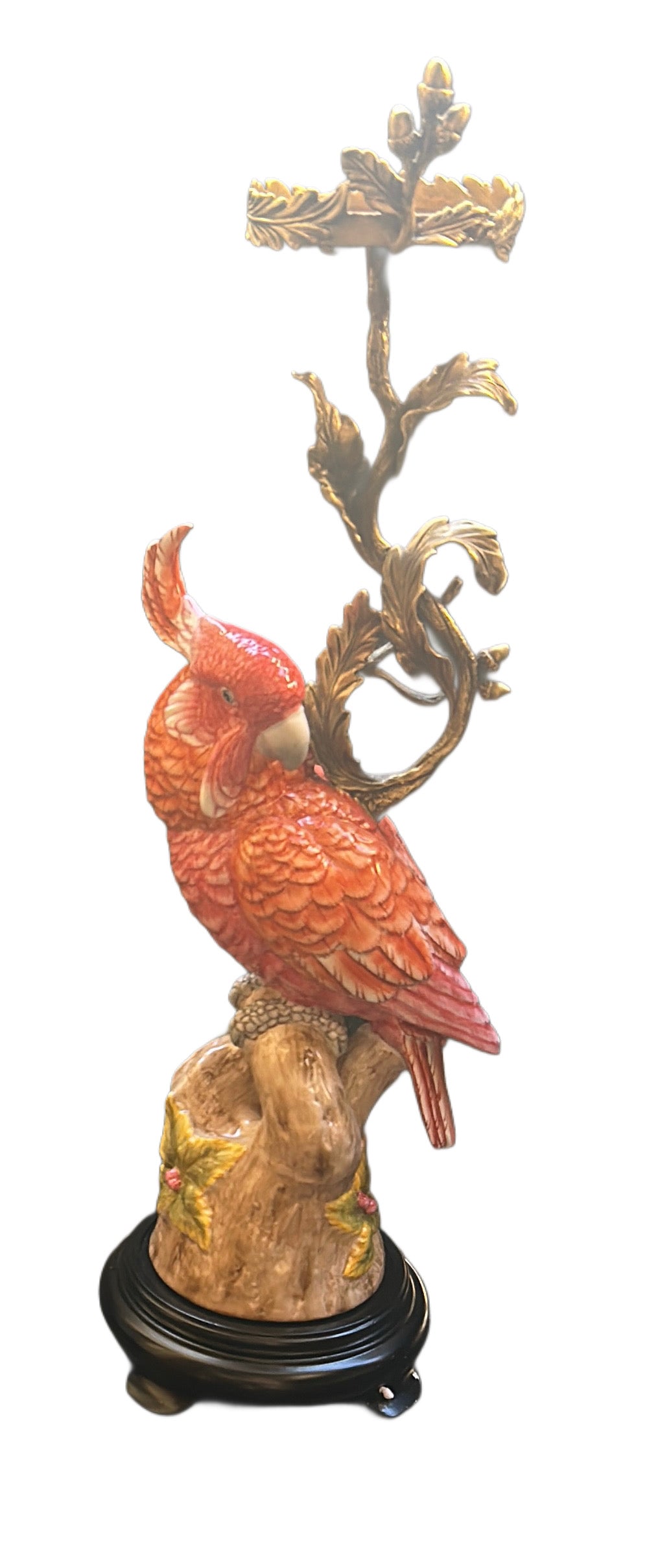 Bellissimo portacandele in porcellana fatto a mano raffigurante un pappagallo cacatua corallo e rosa appollaiato su un ramo bianco con fiori e foglie. Presenta una coppa portacandele in ottone su un pilastro, a forma di rami con foglie e ghiande.Dimensioni: 43 × 12 × 12 centimetri