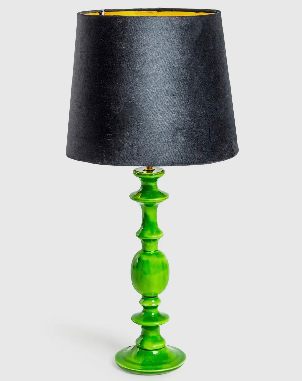 Lampada da tavolo in legno lucido verde con paralume in velluto toderato in metallo Dimensioni del prodotto: