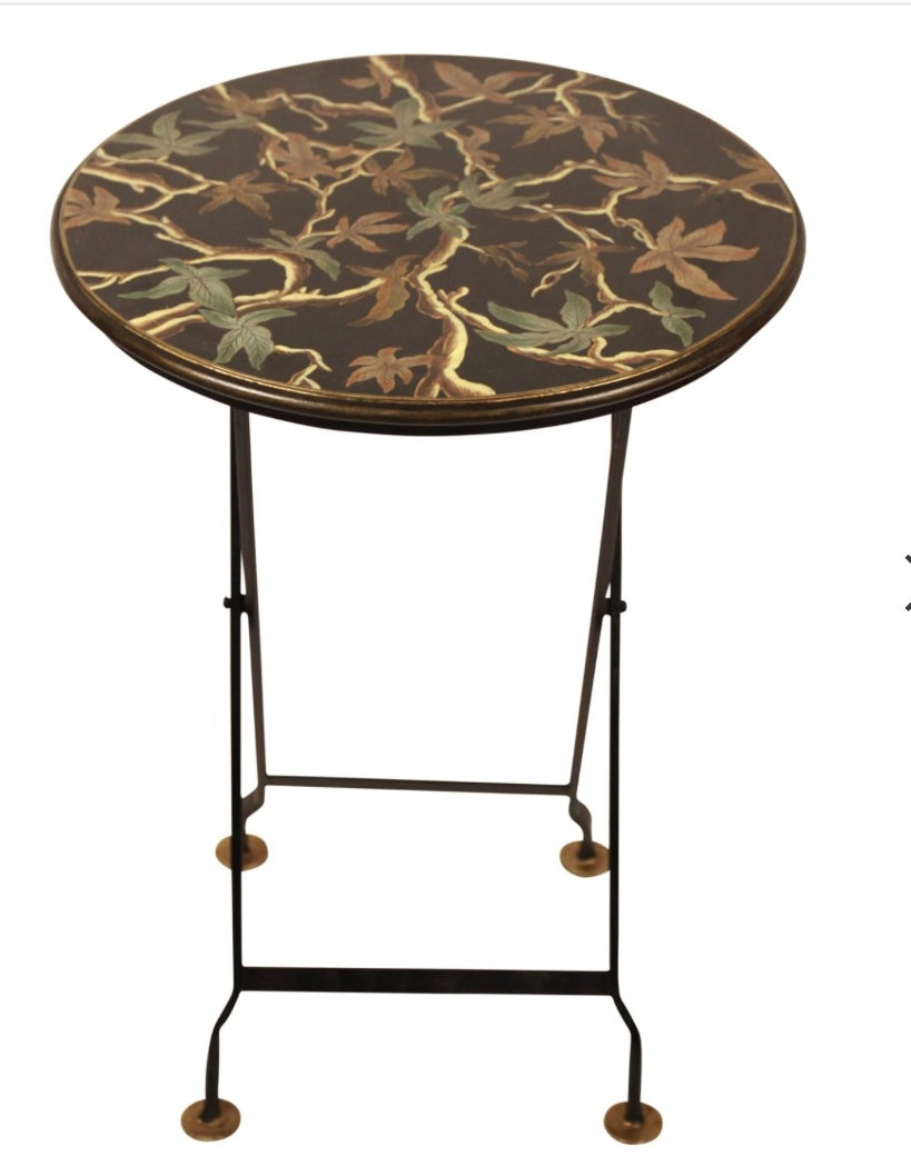 Dimensioni: 59 × 45 × 45 centimetriStupendo tavolo pieghevole rotondo fatto a mano in toleware nero con bordi e piedini dorati. Presenta il motivo Vine con un groviglio di rami di vite con foglie nei toni terrosi del verde e dell'oro.