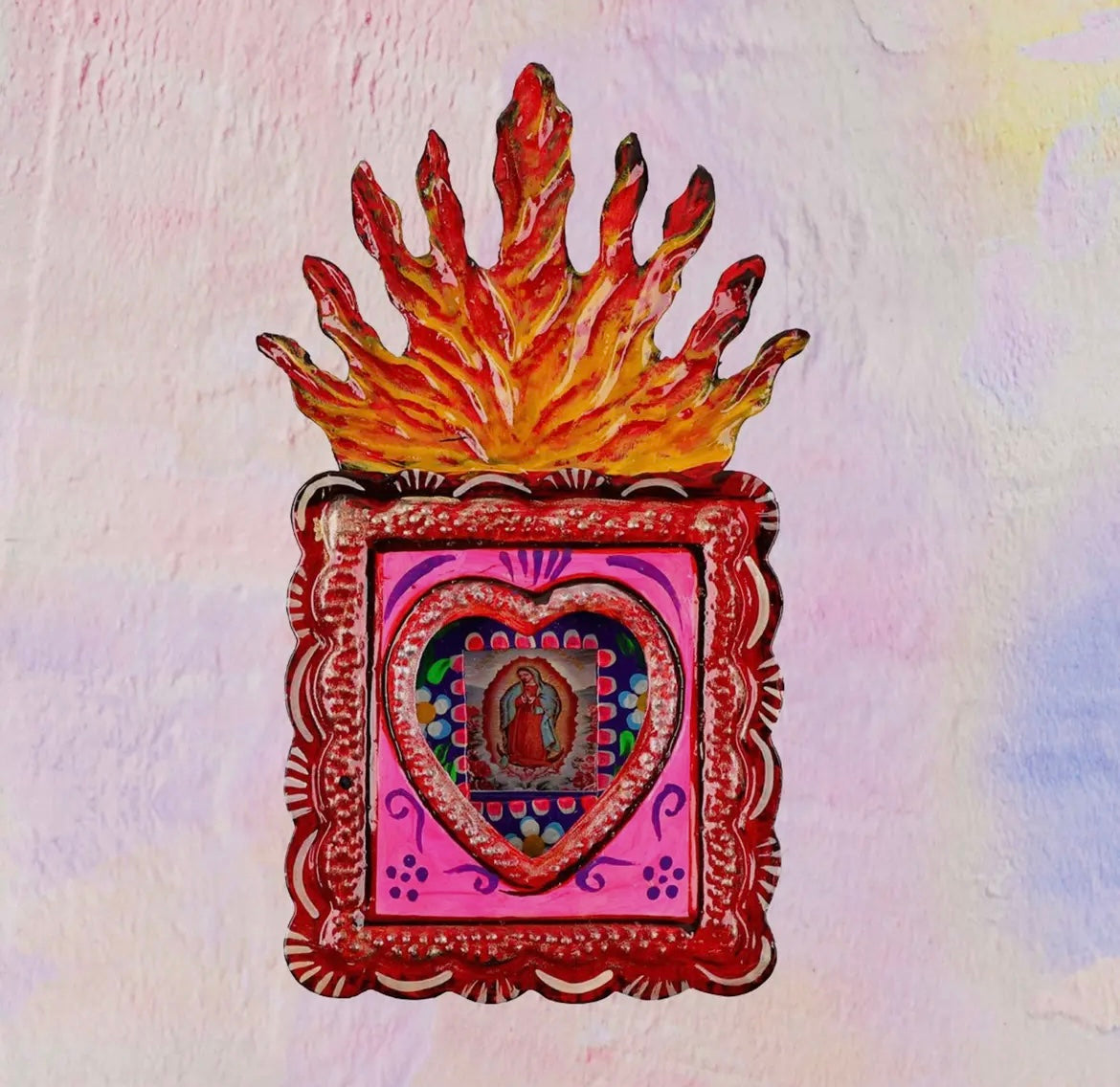 Teca devozionale artigianale messicana con vetro dedicata alla Vergine di Guadalupe,