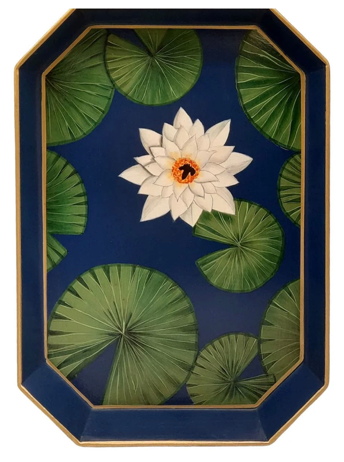Il vassoio ottagonale presenta uno sfondo blu intenso con eleganti bordi dorati. Al centro, un fiore di loto splendidamente dettagliato e le sue foglie sono dipinte in modo intricato, aggiungendo un tocco di serenità e raffinatezza. Perfetto sia per servire che per esporre, questo vassoio combina la bellezza artistica con un design funzionale, rendendolo un'aggiunta sorprendente a qualsiasi spazio.