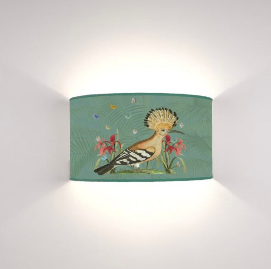 Ventola in tessuto stampato modello Fauna Upupa DX disponibile nel diametro cm 35. Altezza cm 20 con attacco luce standard E27